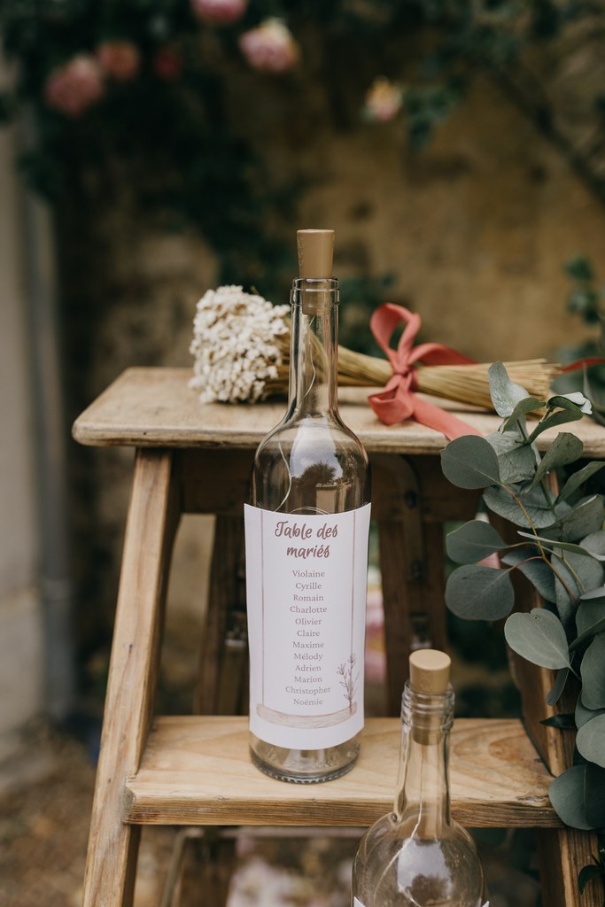 La couleur terracotta, riche et solaire, apportait une touche chaleureuse et moderne, parfaitement équilibrée par la fraîcheur végétale de l’eucalyptus. L’idée était de jouer cette couleur par touche, nous avons donc optés pour les serviettes en gaze de coton. Le contraste des sets en rotin entre les assiettes et le nappage blanc permet de ressortir d’avantage le décor présent sur les tables. Et la branche d’eucalyptus a permis de rehausser le tout. Après plusieurs échanges avec la mariée, nous avons choisi de mettre un menu par assiette.